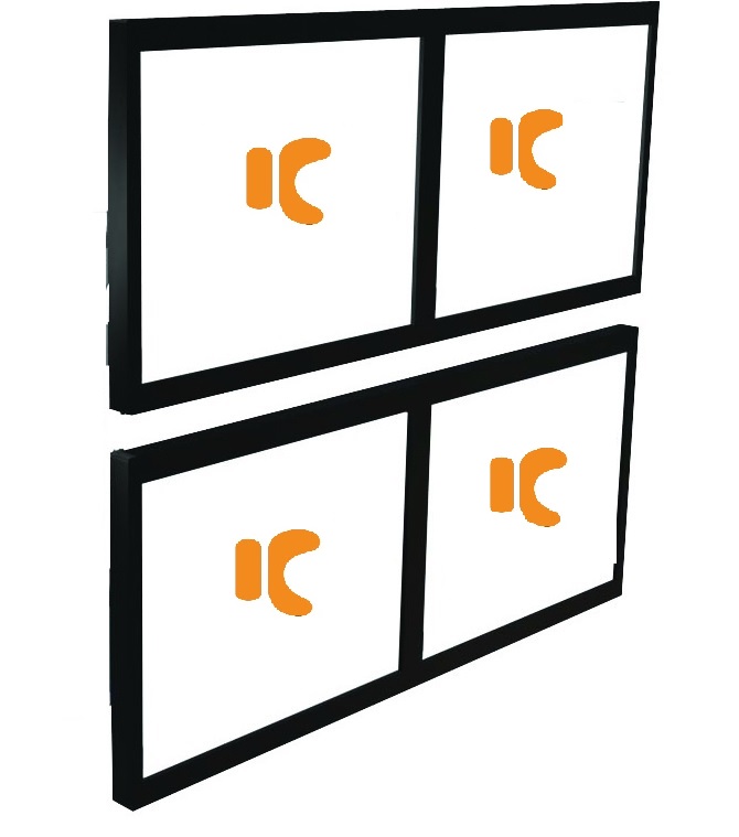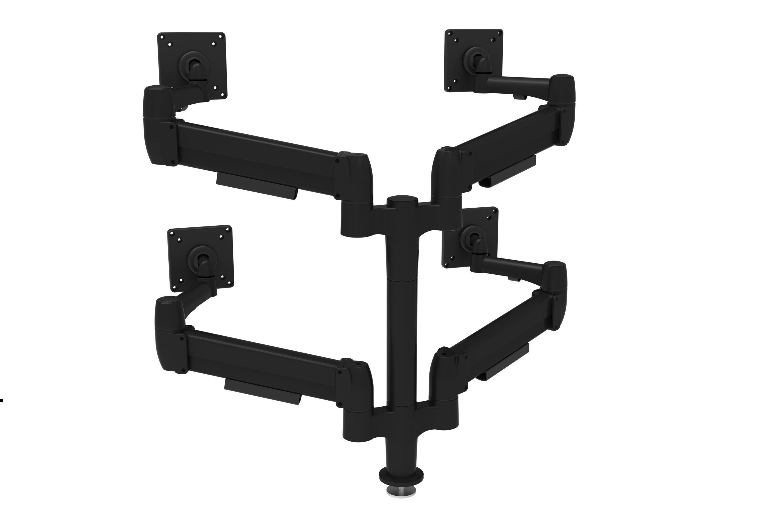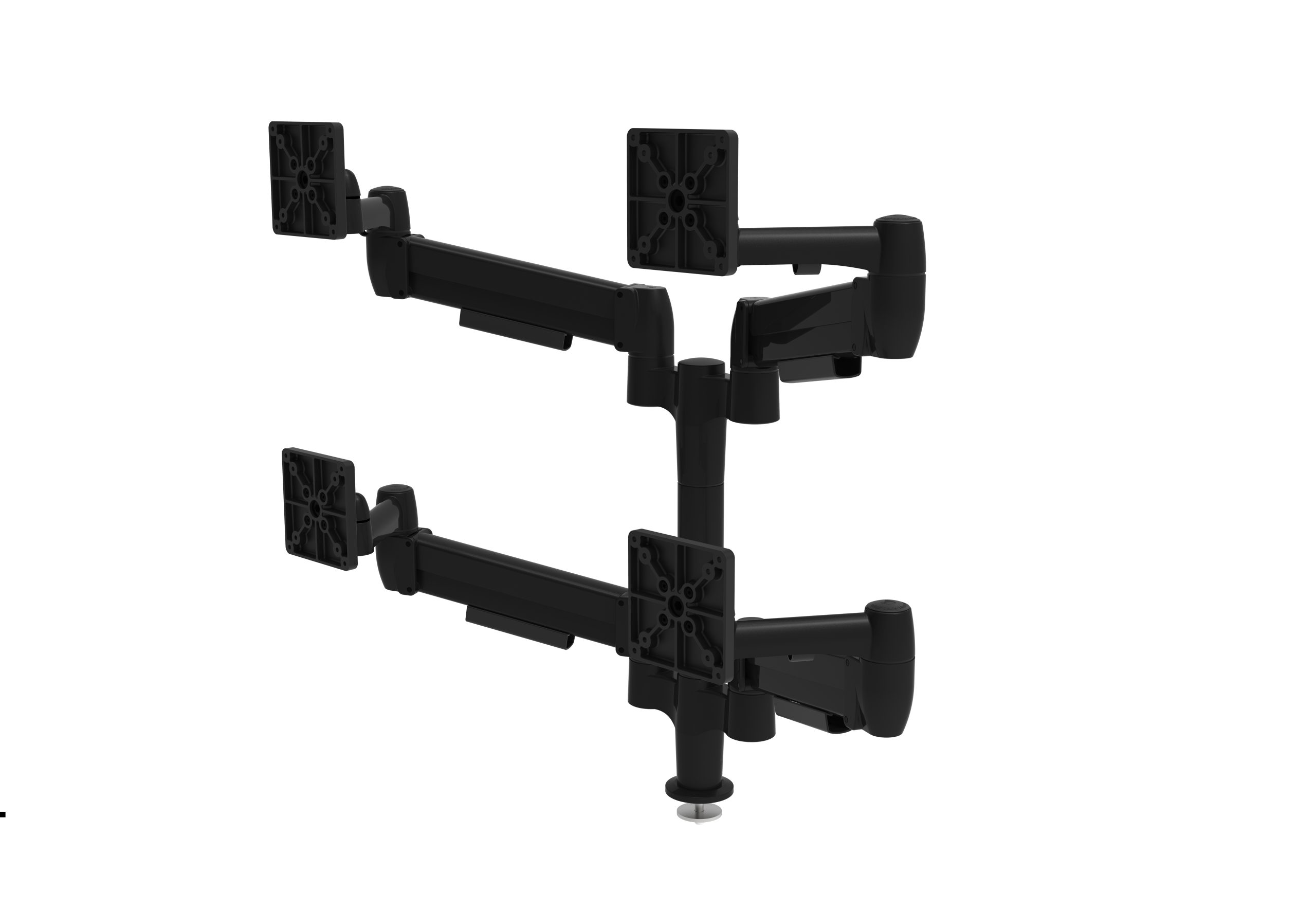 Løsning for plassering av 4 skjermer i system, 2 over 2 under. Hver enkelt skjerm er fleksibel da alle armer er tre-leddet og utstyrt med gasslift. Vektløs justering av skjermer, vertikalt og horisontalt. Leveres med gjennomgående bordfeste for maksimal stabilitet og sikkerhet.